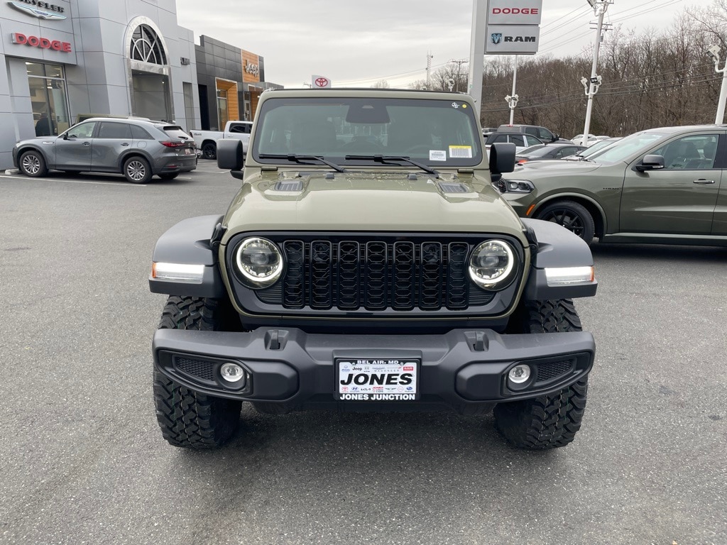 Convenience Group (2-Door Passive Entry, Front Door Locks, Air Conditioning with Auto Temp Control, Air Filtering, Cluster 7.0" TFT Color Display, Emergency/Assistance Call, Heated Front Seats, Heated Steering Wheel, and Universal Garage Door Opener), Quick Order Package 23W Willys (4-Wheel Drive Swing Gate Decal, 7 and 4 Pin Wiring Harness, Advanced Brake Assist, Automatic Headlamps, Auxiliary Switches, Black Grille, Class II Receiver Hitch, Conventional Differential Front Axle, Corning Gorilla Glass, Dana M210 Wide HD Tube Front Axle, Dana M220 Wide Rear Axle, Daytime Running Lamps LED Accents, Deep Tint Sunscreen Windows, E-Locker Rear Axle, Enhanced Adaptive Cruise Control, Front LED Fog Lamps, Full Speed Forward Collision Warning Plus, Injection Molded Black Rear Bumper, LED Premium Reflector Headlamps, Mold in Color Bumper with Gloss Black, Molded in Color Rubicon Highline Flare, MOPAR All-Weather Floor Mats, Off-Road Plus Mode, Power Heated Mirrors, Premium Wrapped Steering Wheel, Security Alarm, Sun Visors with Illuminated Vanity Mirrors, Wheels: 17" x 7.5" Painted Black, Willy's Suspension, and Willys Hood Decal), Quick Order Package 24W Willys, 12.3" Touchscreen Display, 4-Wheel Disc Brakes, 4G LTE Wi-Fi Hot Spot, 8 Speakers, ABS brakes, Air Conditioning, Alpine Premium Audio System, AM/FM radio: SiriusXM with 360L, Apple CarPlay, Apple CarPlay/Android Auto, Aux Battery, Brake assist, Cloth Low-Back Bucket Seats, Compass, Connectivity - US/Canada, Delay-off headlights, Driver door bin, Driver vanity mirror, Dual front impact airbags, Dual front side impact airbags, Electronic Stability Control, For More Info, Call 800-643-2112, Front anti-roll bar, Front Bucket Seats, Front Center Armrest w/Storage, Front fog lights, Front reading lights, Google Android Auto, Illuminated entry, Integrated Center Stack Radio, Integrated roll-over protection, Jeep Trail Rated Kit, Low tire pressure warning, Non-Lock Fuel Cap Without Discriminator, Normal Duty Suspension, Occupant sensing airbag, Outside temperature display, Overhead airbag, Panic alarm, ParkView Rear Back-Up Camera, Passenger door bin, Passenger vanity mirror, Power steering, Power Top Quarter Window Storage Bag, Power windows, Radio data system, Radio: Uconnect 5 with 12.3" Display, Rear anti-roll bar, Rear reading lights, Rear Window Defroster, Rear Window Wiper/Washer, Remote keyless entry, Removable Rear Quarter Windows, SiriusXM Radio Service, SiriusXM with 360L, Sky 1-Touch Power Top, Speed control, Split folding rear seat, Steering wheel mounted audio controls, Stop-Start Dual Battery System, Tachometer, Telescoping steering wheel, Tilt steering wheel, Traction control, Trip computer, Variably intermittent wipers, and Wheels: 17" x 7.5" Black Steel Styled.